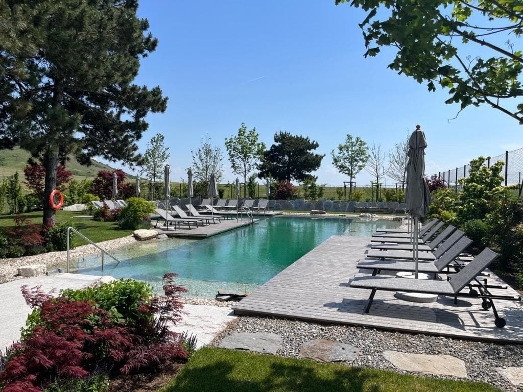 Entdecken Sie unseren Wellnessbereich mit Sauna und einem erfrischenden Naturpool. Genießen Sie die entspannende Atmosphäre und die modernen Fitnessgeräte.